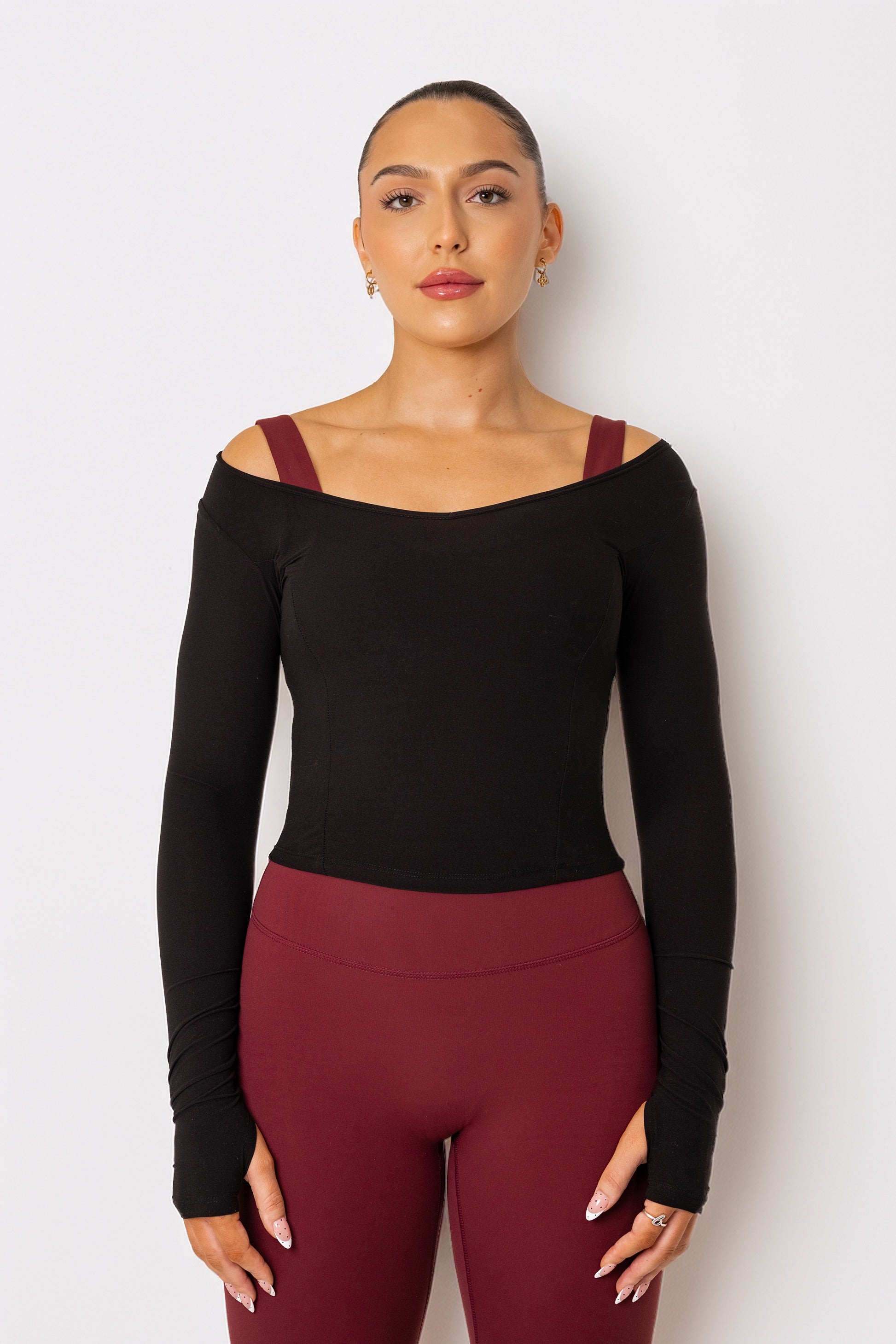 - Convertible neckline designed to be worn off shoulders or as a wide scoop neck